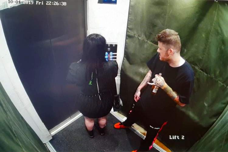 海外の監視カメラ映像。 エレベーターに乗り込んで来たカップルが酔っぱらってるのかカゴ内でズボンとパンツを下ろしオシッコをし始めてしまう。